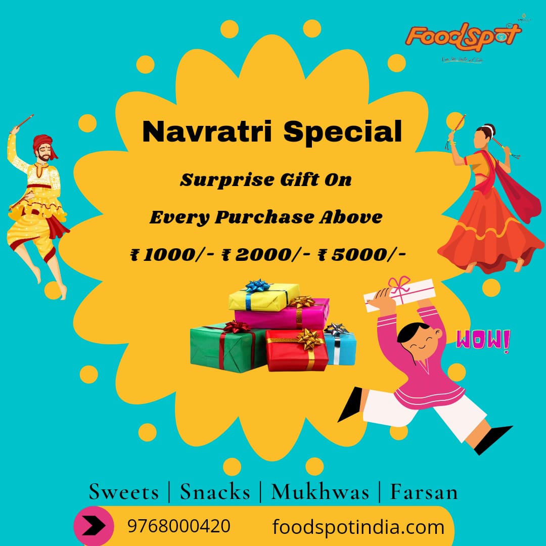This Navratri add some more Happiness with our Healthy Snacks, Fresh Hot Farshan, Sweets, Farsan, Dryfruits, etc.